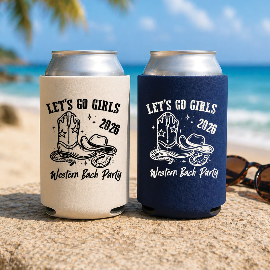 Personalized Western Bachelorette Can Coolers, Cowgirl βLetβs Go Girls 2026β Can Sleeves, Western Bach Party Favors